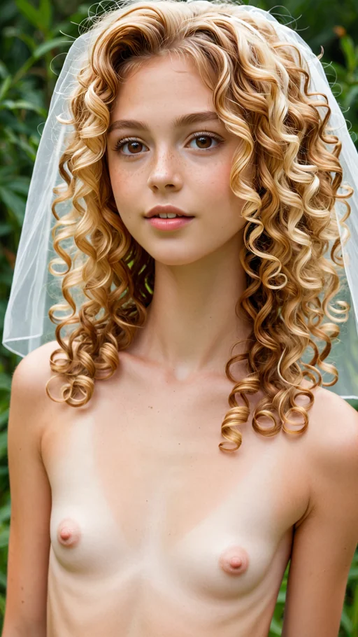 A young woman with curly hair poses nude in a forest setting, showcasing her natural beauty and the serene environment around her.